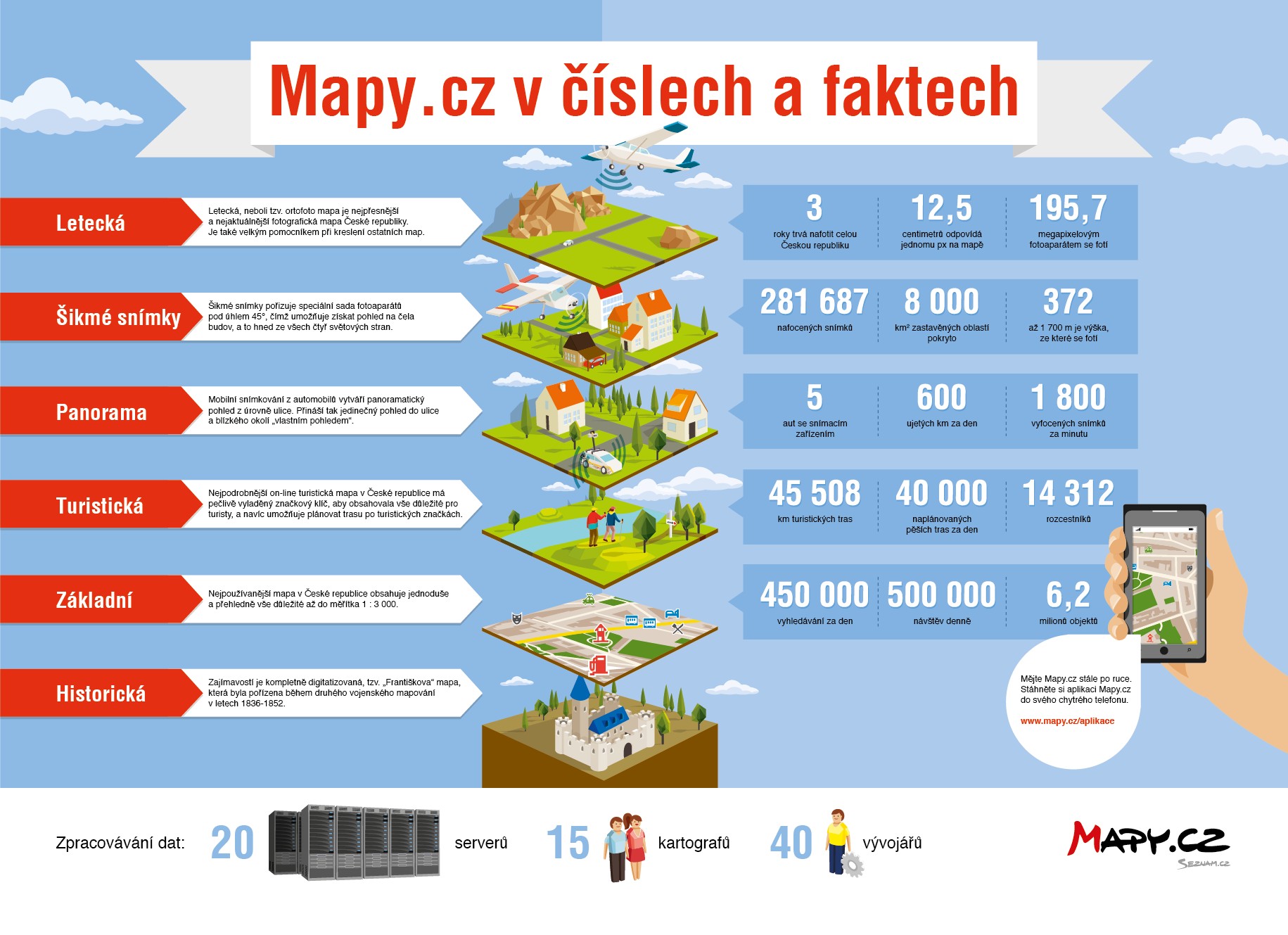 Díky grafice už máme jasno v tom, z jaké výšky se fotí a kolik snímků tak vznikne za minutu. A to rozhodně není všechno – dozvěděli jsme se také takové množství zajímavostí, že svými znalostmi budeme moci ohromovat v baru či kruhu přátel. Třeba víme, jak vznikají panoramatické záběry, k čemu jsou dobré šikmé snímky – a také pikantnosti o turistické a historické mapě. Zjistěte i vy více o službě mapy.cz… a na příští plánování trasy se již rozhodně budete dívat jiným pohledem.