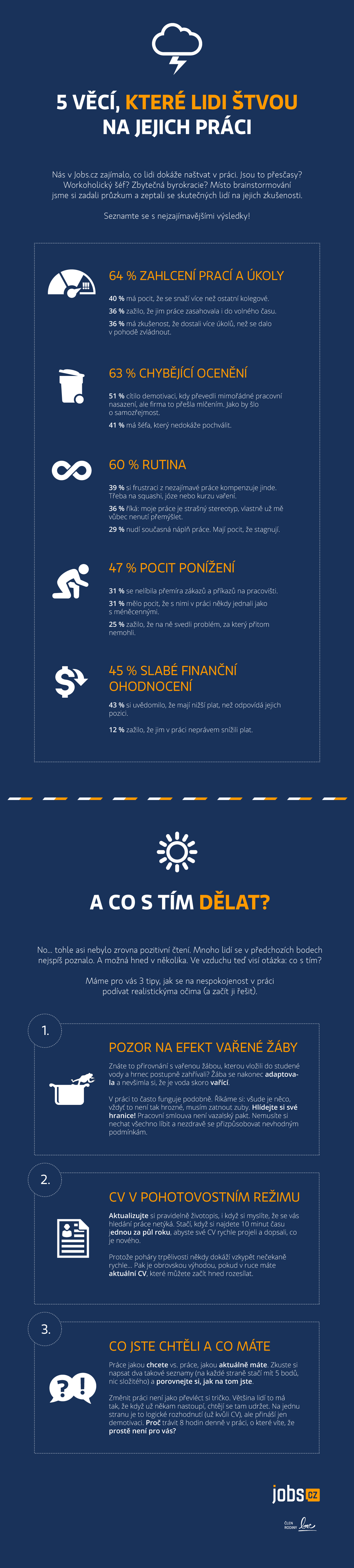 Pracovně laděná infografika naštěstí neobsahuje pouze negativní čísla, ale také (docela podrobný) návod, co teď s tím. Pochopitelně, pokud jste se našli jen v několika málo nevýhodách a většinu času se v práci cítíte šťastní, nemusíte hned pozici měnit. Tipy se však nebudou hodit jen těm, kdo se pro změnu zaměstnání již rozhodli – vhod přijdou i lidem, kdo o hledání nového místa zatím neuvažují, ale po případné lepší nabídce by sáhli. Přečtěte si tedy, co s nespokojeností v práci (ve které trávíme třetinu dne!) dělat.