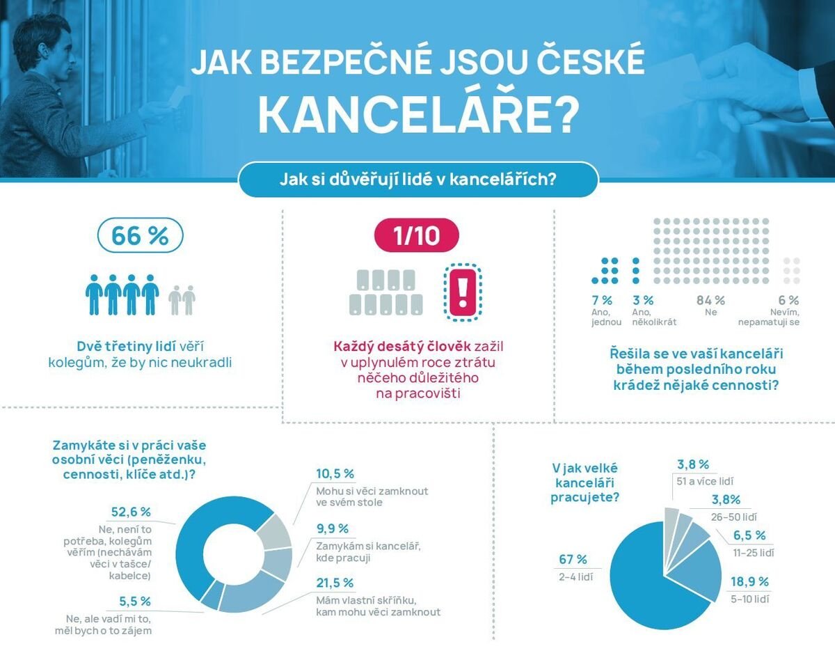 Důvěřuj, ale raději si cennosti zamkni, tak by se dal shrnout přístup téměř poloviny Čechů. Ti si své věci totiž zamykají nebo o to alespoň mají zájem. 52,6 % lidí pak nechává své věci v klidu bez dozoru. Možná je to také tím, že většina lidí pracuje v kancelářích, ve kterých se nachází maximálně další 3 spolupracovníci.