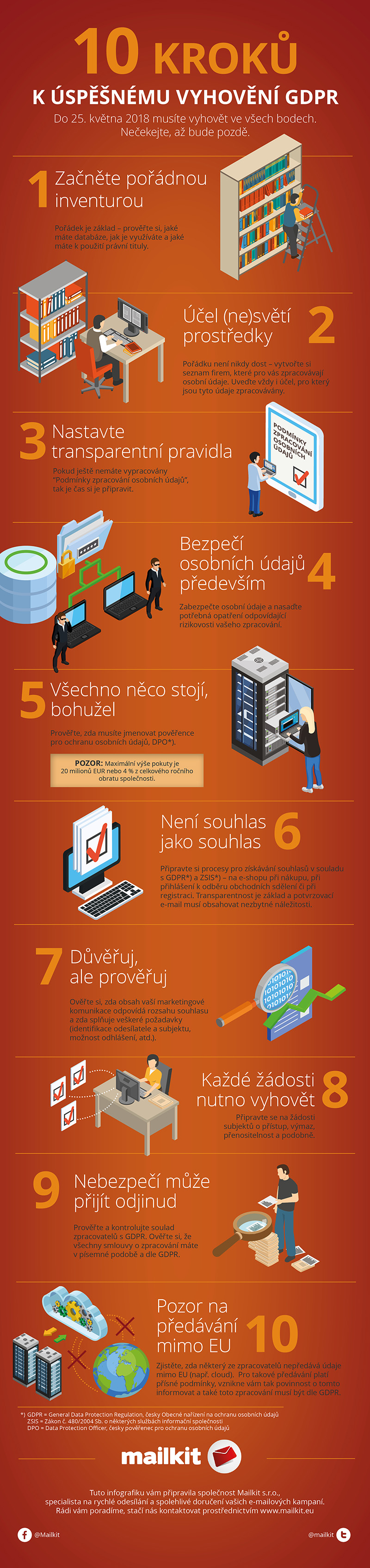 Infografika, kterou pro vás dnes sdílíme, se na nové nařízení podrobně zaměřuje. V celkem 10 krocích vám poradí, jak úspěšně vyhovět GDPR, na co se připravit a kde se raději obrnit trpělivostí. Nezáleží na tom, zda jste profesionál na slovo vzatý, nebo začátečník, který sotva začal sbírat e-mailové kontakty – nařízení se bude týkat všech. Proto doporučujeme se na ně pořádně připravit (třeba s pomocí infografiky níže) a nenechat se překvapit nepříjemnou pokutou či jinými potížemi!