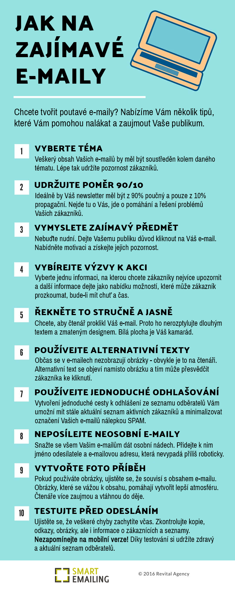 Jak ale na e-maily, které doopravdy zaujmou, nalákají cílové publikum a třeba i prodají to, co mají prodat? To poradí infografika od samotných expertů v této oblasti – SmartEmailingu. Čeští odborníci na e-mailing ví, jak tvořit elektronické zprávy, které nebudou končit ve spamových filtrech, ale budou s nadšením otevírány a čteny či prohlíženy. Koukněte na dnešní e-mailingovou infografiku a zjistěte, jak na tento obor vyzrát.